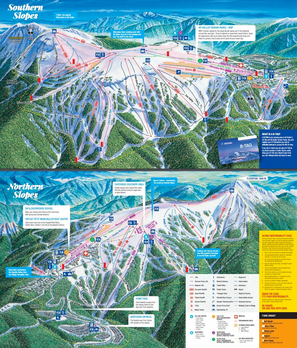 Intermediate skiers dominate the mountain, with trails like “Shakey Knees” and “Little Buller Spur” offering rolling terrain and scenic descents through snow gum forests. These runs are groomed regularly and provide a satisfying mix of speed and flow.