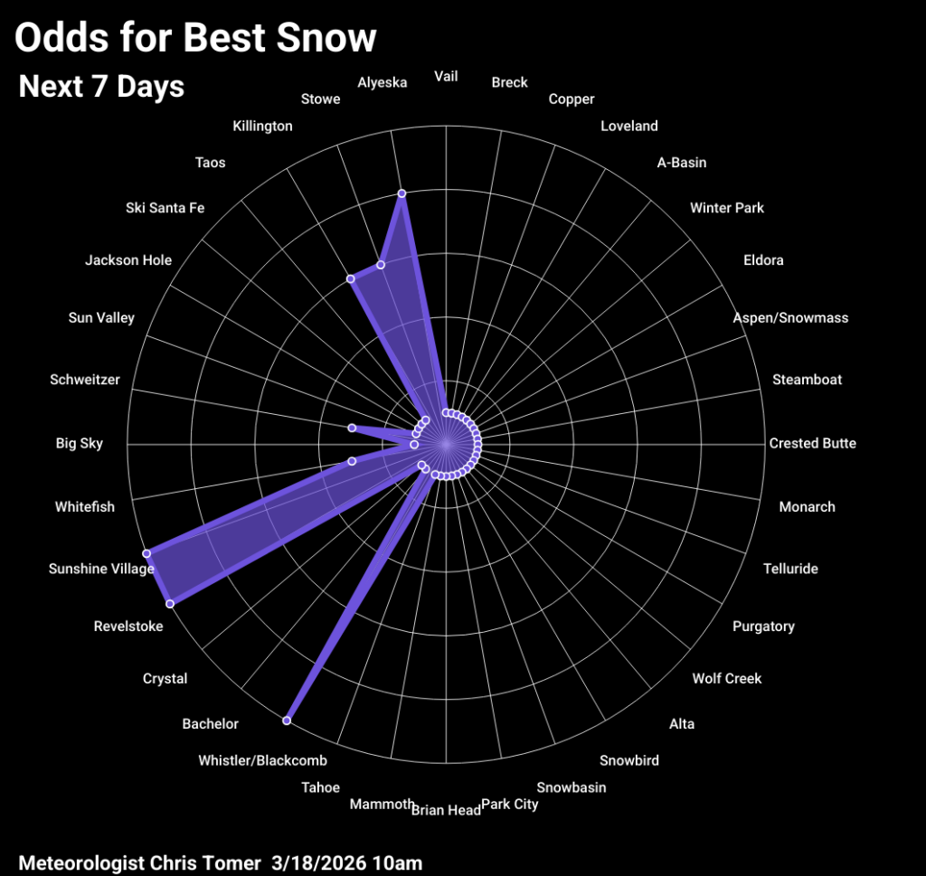 Expect lingering snow for Banff resorts into 3/26, moderate to heavy accumulation 3/28-3/30, and light snow 4/2. Total snow accumulation of 10-20 inches at Sunshine, Mt. Norquay, and Marmot Basin. For Interior British Columbia I’m calling for lingering snow into early 3/26, moderate snow the afternoon of 3/29 into 3/30, and light snow 4/3. Total snow accumulation of 5-10 inches at Revelstoke, Fernie, and Kicking Horse, with only an inch at Red Mountain.