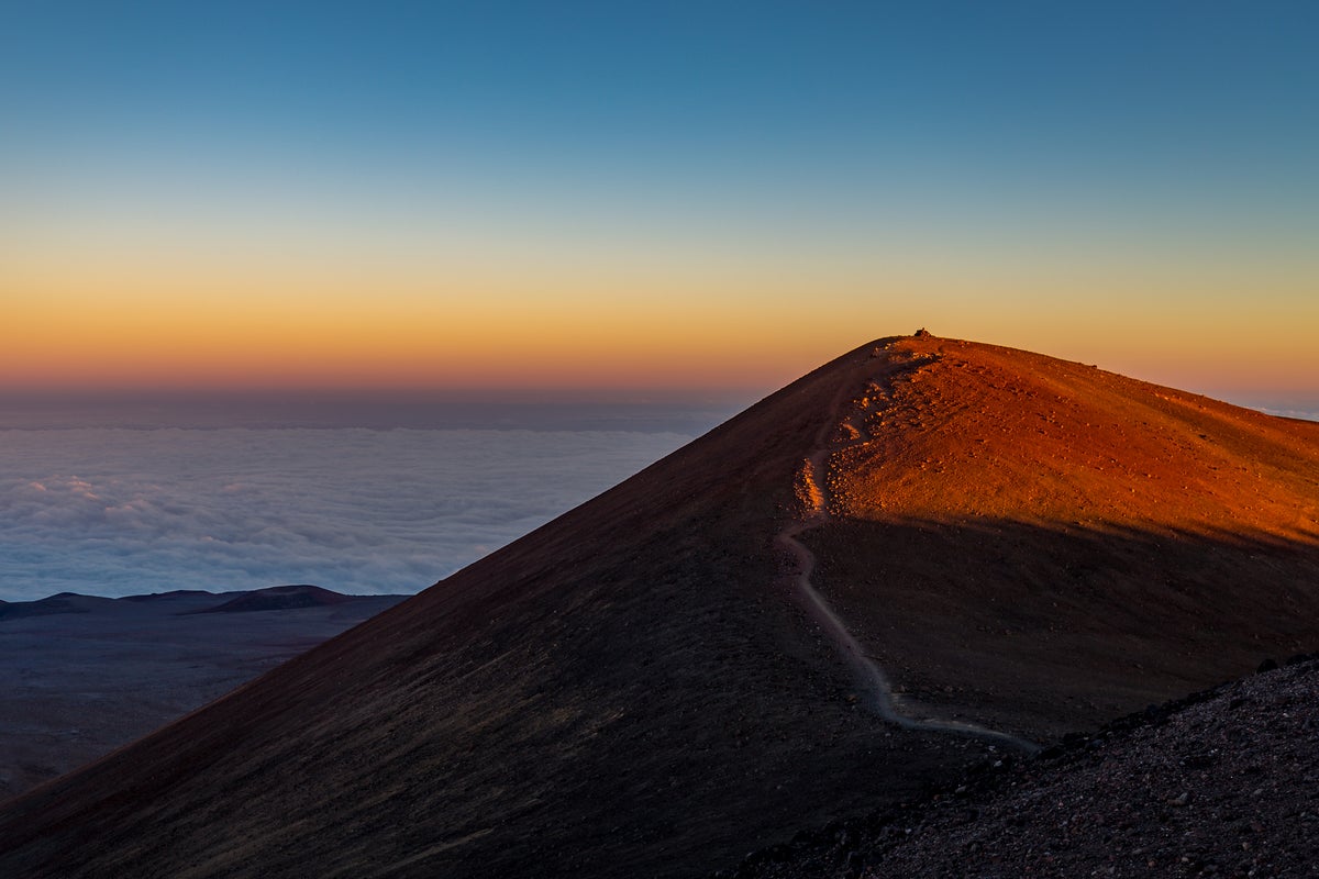 Although it’s not technically a 14er, Hawaii’s Mauna Kea comes so close that we’re including it. Rising to 13,803 feet, this massive volcano hike delivers a high‑altitude challenge that surprises many hikers who start their day at sea level. The Humu‘ula Trail begins near the visitor center at about 9,200 feet high and gains 4,500 feet over 13 miles round‑trip. The route is non‑technical but demanding, with steep volcanic slopes, loose cinder, and full exposure to sun, wind, and rapidly changing weather. Because the summit area is extremely dry, cold, and windy—and because altitude sickness is common—visitors are strongly encouraged to acclimate at the Visitor Information Station, hydrate well, and turn back if altitude illness symptoms develop. Rangers also advise that hikers register at the station, avoid ascending if they’ve recently been scuba diving, and be prepared for winter‑like conditions even when the beaches below are warm. Additionally, wearing protective glasses and a face mask is recommended, as loose volcanic ash can irritate the skin, eyes and lungs.