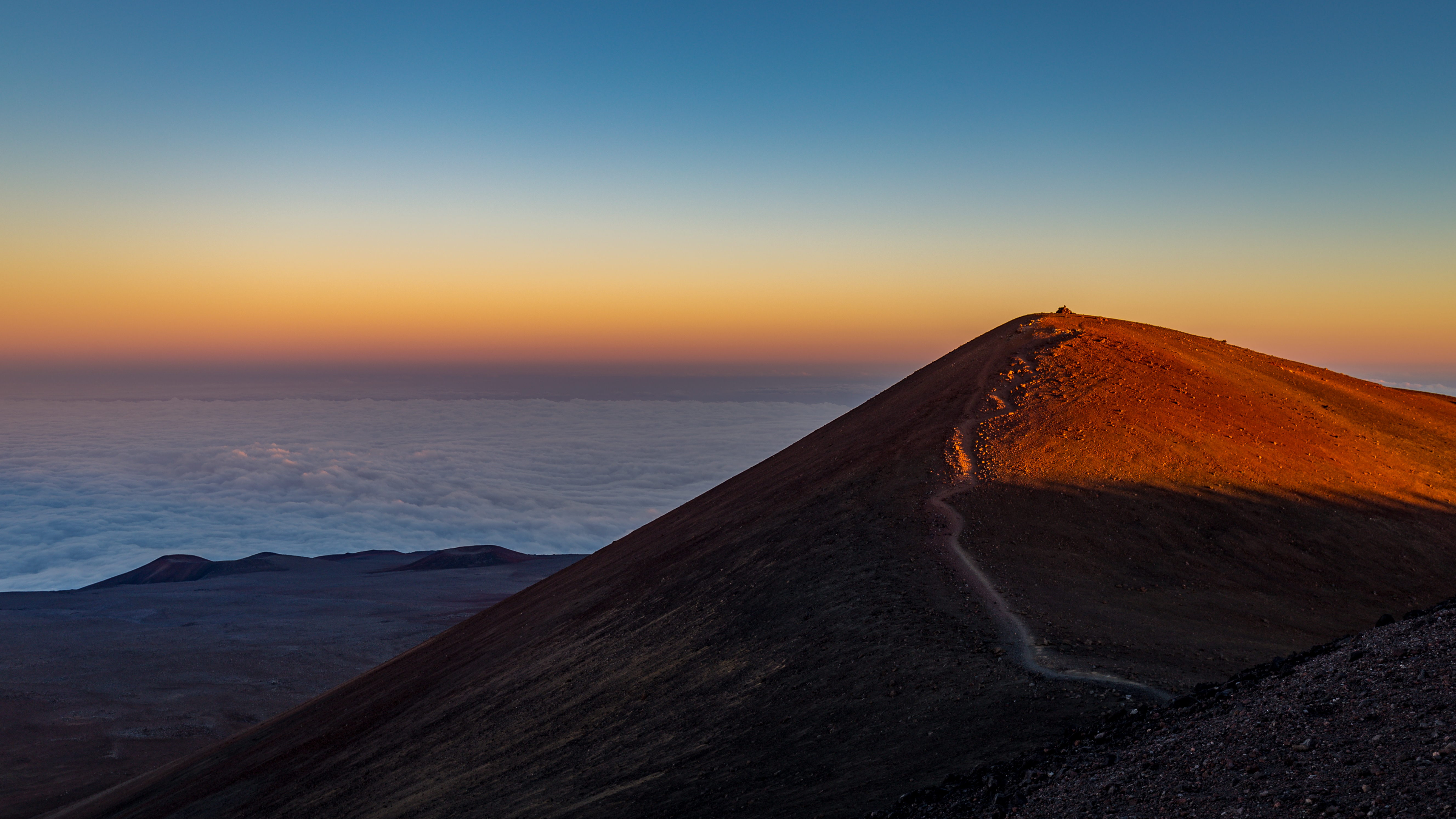 Although it’s not technically a 14er, Hawaii’s Mauna Kea comes so close that we’re including it. Rising to 13,803 feet, this massive volcano hike delivers a high‑altitude challenge that surprises many hikers who start their day at sea level. The Humu‘ula Trail begins near the visitor center at about 9,200 feet high and gains 4,500 feet over 13 miles round‑trip. The route is non‑technical but demanding, with steep volcanic slopes, loose cinder, and full exposure to sun, wind, and rapidly changing weather. Because the summit area is extremely dry, cold, and windy—and because altitude sickness is common—visitors are strongly encouraged to acclimate at the Visitor Information Station, hydrate well, and turn back if altitude illness symptoms develop. Rangers also advise that hikers register at the station, avoid ascending if they’ve recently been scuba diving, and be prepared for winter‑like conditions even when the beaches below are warm. Additionally, wearing protective glasses and a face mask is recommended, as loose volcanic ash can irritate the skin, eyes and lungs.