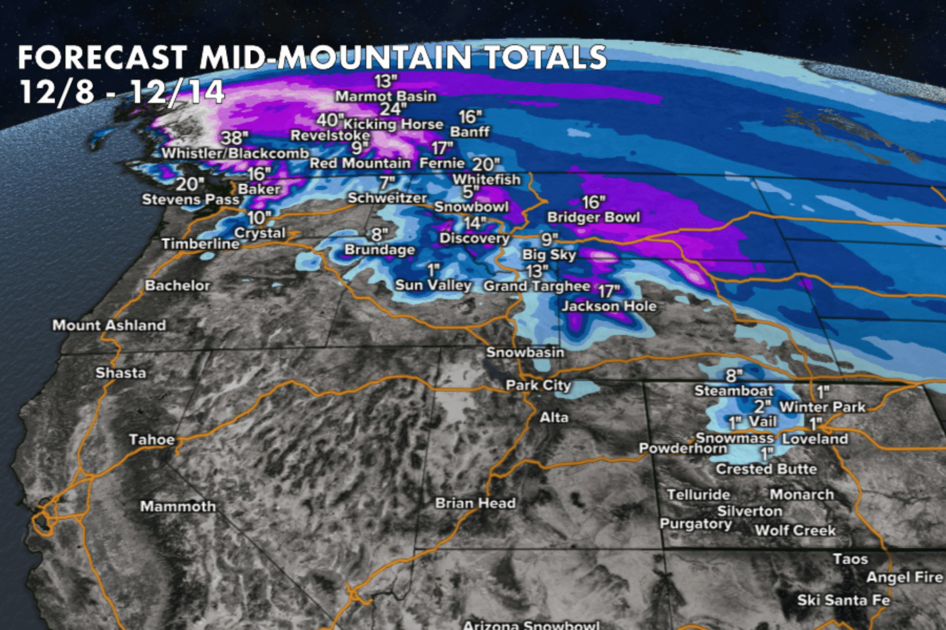 Warm Pacific air forces the rain/snow line to higher elevations in the Pacific Northwest. Expect heavy snow accumulation 12/8-12/11, light snow 12/12, and heavy snow 12/14-12/16. Total snow accumulation of 1-3 feet (or more), with the higher end of those totals at ski resorts that are at a higher elevation.