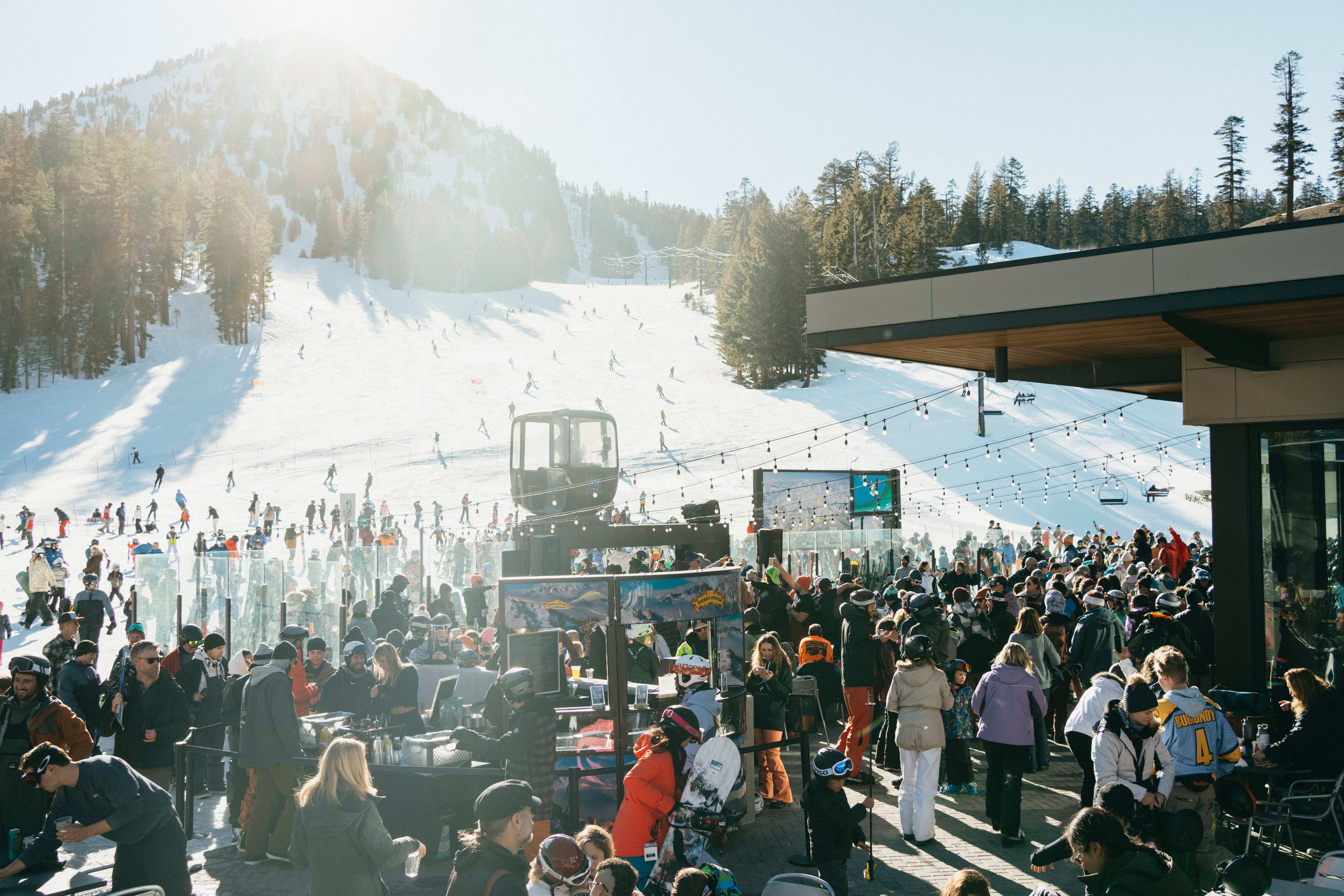 Mammoth Mountain nails the après trifecta: live music, bluebird skies, and killer views. Mammoth’s legendary patio parties turn Canyon Lodge into an après scene, complete with a live DJ and a crowd that’s always ready to throw down. Past weekends have featured big-name talent like LP Giobbi and NEIL FRANCES, drink specials, and pop-up activations from partners including Red Bull, Athletic Brewing, Sun Bum, and more. If your perfect run ends with a cold drink, loud beats, and sunshine, Mammoth’s where you’ll want to drop in.